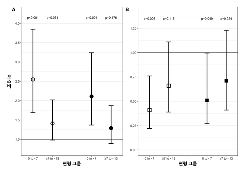 로지스틱 회귀분석 결과, 7세 미만 연령 군이 13세 이상 연령 군과 비교하였을 때 오즈비 2.11로 높았으며 항고혈압제 약물 치료를 받을 확률은 7세 미만 연령 군이 13세 이상 연령 군과 비교하였을 때 오즈비 0.5로 낮게 확인되었다(그림 2). 또한 7세 이상 486명의 949번의 방문 시 24시간 혈압 측정 검사를 시행하였으며 이를 7세 이상 13세 미만 연령 군과 13세 이상 연령 군으로 나누어 비교해보았을 때, 24시간 혈압 측정 검사에서 고혈압의 기준에 해당하였던 경우는 두 연령 군에서 각각 57%와 52%로 비슷하였으며 이 중 절반에 해당하는 환자만 임상의에 의해 고혈압으로 진단받았다.