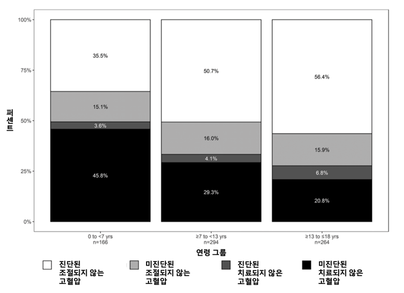 그러나, 고혈압이 소아청소년 만성 콩팥병의 진행과 심혈관계 합병증 발병에 미치는 악영향을 고려해볼 때 환자의 고혈압이 진단되지 않고 혈압이 조절되지 않는 상태가 장기간 지속되는 것은 상당히 우려스러운 상황이므로, 본 연구는 소아청소년 만성 콩팥병 환자의 고혈압 진단과 치료가 얼마나 적절하게 이루어지고 있는지를 대규모 코호트에서 평가하였다는 점에서 임상적으로 큰 의의를 가진다.연구진은 경도에서 중증도의 소아청소년 만성 콩팥병 환자에서 7세 미만의 어린 연령 군에서 미진단 고혈압의 비율이 가장 높으며 혈압 조절이 적절하게 이루어지지 않고 있음을 확인하였다.