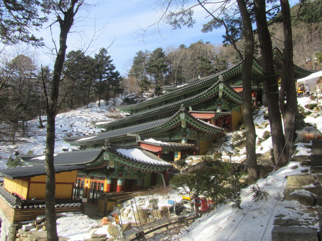 월정사에 들러 상징인 팔각구층석탑을 사진에 담고 천천히 절을 한 바퀴 돌아본다. 월정사에서 상원사를 거쳐 석가모니의 진신사리가 모셔진 적멸보궁까지 가는 천년의 길이 복원되어 선재길로 불린다. 겨울산행으로 눈이 많이 쌓이고 감기도 심해서 월정사에서 상원사까지는 차로 대신한다. 비포장도로인 흙길이 얼어붙어 평평하고 미끄러질 듯 반질반질하다. 계곡의 맑은 물은 그대로 얼어붙어 물 흐르듯 물결무늬를 이룬다. 마치 영화에서처럼 갑자기 주변 세상이 얼어버린 느낌이다.