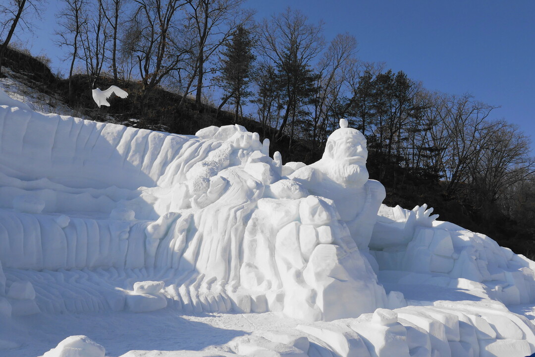 축제장 건너편 강가에 눈꽃과 얼음꽃이 활짝 핀 겨울왕국에는 하얀 꽃밭을 배경으로 사진을 찍느라 정신없다. 강을 건너는 터널에 들어서니 반짝이는 고드름들이 종유석처럼 매달려 있어 신비한 동굴에 온 느낌이다. 엄마 아빠의 손을 잡고 온 아이들은 신기한 듯 바닥에 떨어진 고드름을 주워 서로 자랑하며 기쁜 표정이다. 축제장의 커다란 조각상 앞에 저마다 올해의 소원을 적어 매달며 소원을 빌어본다. 언덕으로 오르니 강 건너로 보이는 절벽의 나무들과 바위, 사이사이로 하얀 눈과 얼음이 어우러져 멋진 풍광을 만들어준다. 종착지에서 이곳 오대쌀로 만든 컵떡국을 맛있게 먹으며 2시간여 만보걷기를 마무리한다.