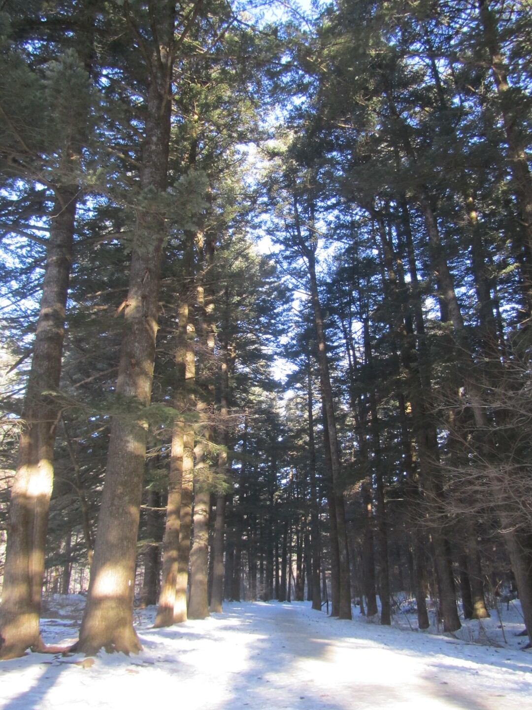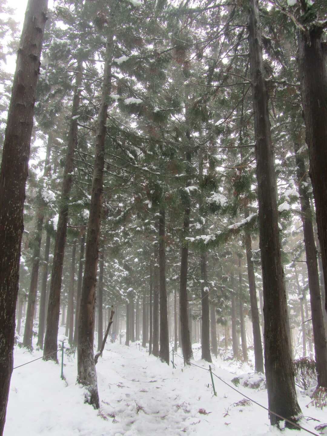 세계지도 같은 개울가의 아름다운 풍경에 흠뻑 빠져 잠시 걸음을 멈춘다. 속밭에 다다르자 쭉쭉 하늘로 뻗은 푸른 나무들 위에 눈이 쌓여 만들어진 천연의 ‘크리스마스트리’가 일렬로 서 있다. 삼나무 숲으로 들어서자 맑았던 날씨에 갑자기 비가 내리기 시작이다. 삼나무에 쌓였던 눈들이 살며시 녹아내려 피톤치드가 풍부한 나무비를 뿌린다. 처음으로 맞아보는 피톤치드 비에 감격하고 있는데 가끔씩 하얀 눈폭탄도 떨어져 긴장감을 더한다.
