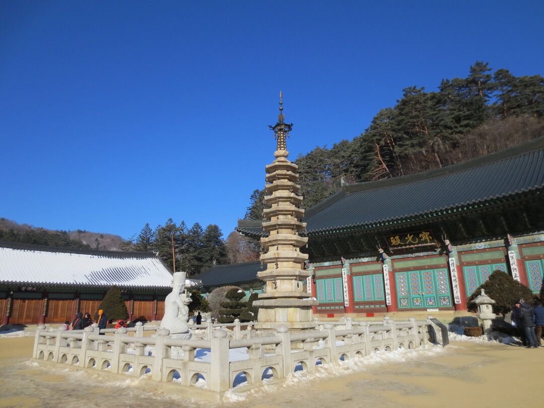 상원사로 향하는 길 입구에 버섯모양의 돌기둥이 귀엽게 서 있다. 관대걸이라 하여 조선 초 세조 임금이 이곳에서 목욕할 때 의관을 걸어둔 곳이란다. 상원사에 들어서니 맑은 거울 탁자 표면으로 천장의 부처상이 비추어 보여서 그저 신기하다. 상원사를 나와 산비탈에 5층 구조로 멋지게 지어진 중대사자암을 지나 수많은 검정 현무암으로 만들어진 돌계단을 오르니 무릉도원으로 향하는 기분이다. 드디어 푸른 하늘 위로 부처님의 진신사리가 모셔진 적멸보궁이 화려한 모습을 드러낸다. 3시간여의 걷기를 마치고 20가지 이상의 반찬으로 차려진 산채정식으로 오늘 일정을 마무리한다.