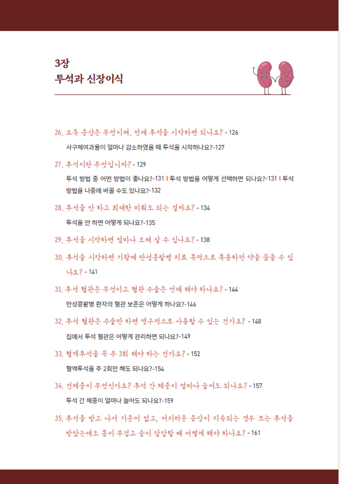 3장 투석과 신장이식에서, ‘혈액투석을 꼭 주 3회 해야 하는 건가요?’의 질문에 대한 답을 꼭 소개해 드리고 싶습니다. 카톨릭 의대 김용균 교수님이 작성해 주신 부분인데, 주 2회 투석하던 환자가 투석량이 부족하게 되어 주 3회로 늘려야 할 때 환자 설득이 어려운 경우가 있습니다. 막상 환자 앞에서 부족한 투석량을 어떻게 설명하여야 할지 난감할 때가 많은데, 김용균 교수님의 글을 보시면 자세하면서도 동시에 간단하게 설명이 되어 있어 많은 도움이 될 것 같습니다. 실제 콩팥의 여과율과 혈액투석을 비교하여 제시하였는데, 주 2회 투석 시 여과량, 주 3회 투석 시 여과량을 숫자로 보여주고 있어, 누구라도 설득당하지 않을 수가 없을 것 같습니다. 숫자와 산수가 난무하는 가운데에도 글을 관통하고 있는 주된 감정은 ‘환자에 대한 걱정과 애정’이라는 점에서 우리 선생님들의 마음을 대변하고 있어 편집할 때 특히 눈에 띄었습니다.