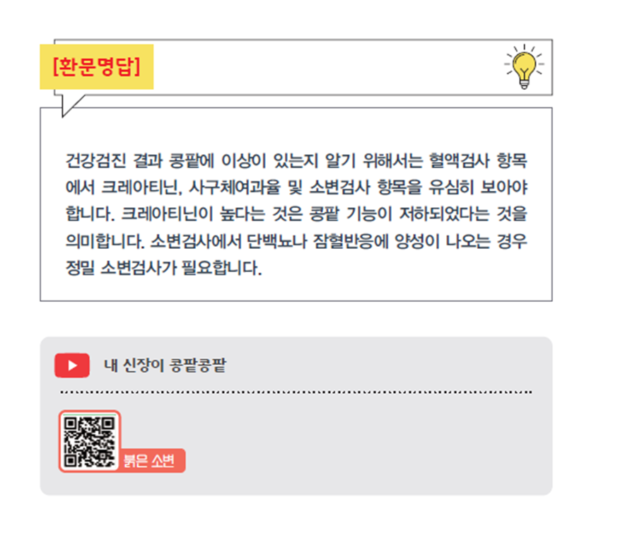 첫째, 각 주제 질문에는 한눈에 알아보기 쉬운 일러스트를 적어도 한 개 이상 삽입하여 내용 이해에 도움이 될 수 있게 노력하였습니다. 둘째로, 원고가 끝나는 지점에 ‘환문명답’이라는 한두 줄로 내용을 요약하여 상자 안에 제시함으로써 내용 정리에 도움이 되도록 구성하였습니다. 셋째로, 환문명답 상자 아래에는 ‘내 신장이 콩팥콩팥’ 이라는 신장학회에서 운영하는 유튜브 채널로 연동되는 QR 코드를 삽입하여 태그하는 동시에 동영상으로도 관련된 내용을 확인할 수 있게 구성하였습니다.