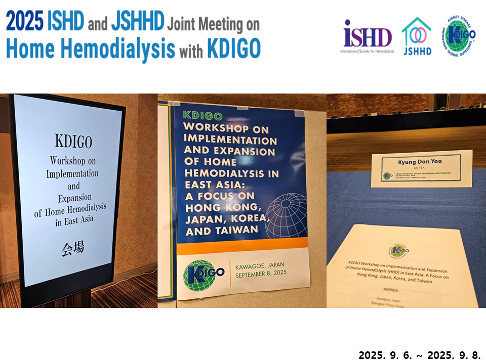현재 재택혈액투석은 전 세계 40개국 이상에서 이미 시행되고 있으나, 실제 이용률은 아직 제한적입니다. 이러한 원인을 고찰하고 각 국가의 투석 치료 발전 방향을 논의하기 위해, 2025년 9월 일본에서 국제혈액투석학회와 일본재택혈액투석학회가 공동으로 개최한 ISHD & JSHHD Joint Meeting with KDIGO가 열렸으며, 대한신장학회 박형천 이사장과 대한신장학회 산하 재택혈액투석연구회(회장 서울의대 김동기) 회원분들과 함께 참석하였습니다.