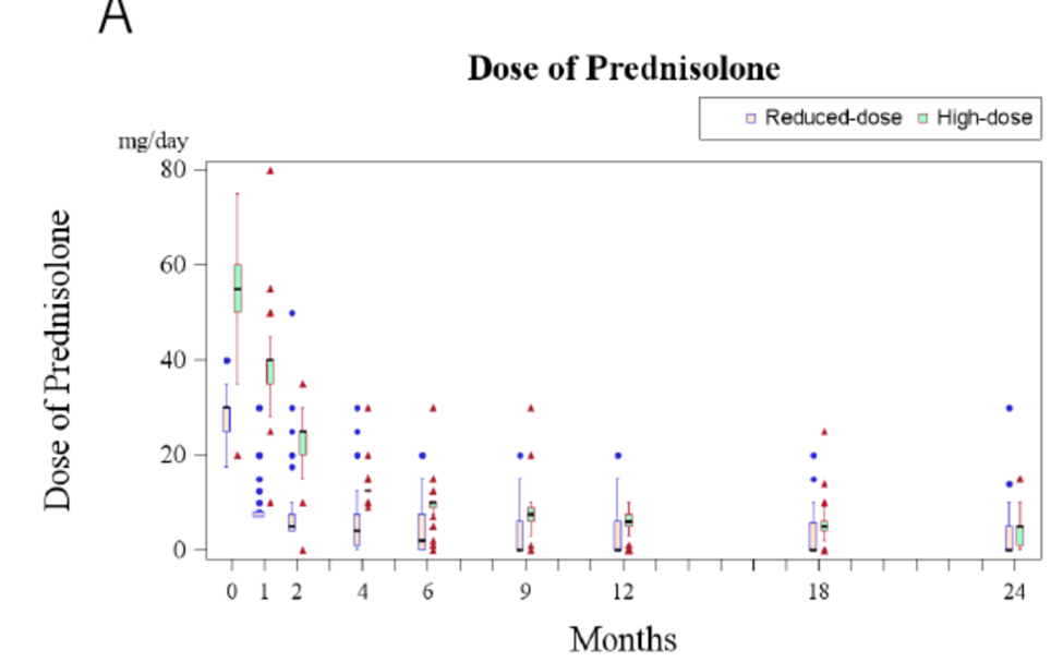 프로토콜로 정의된 치료로 완치를 달성한 환자들 중, 저용량군의 환자 중 대다수(89.7%)가 프레드니솔론을 중단하였고 고용량군의 환자 중 15.5%가 중단하였습니다. 치료 시작 24개월 후, 프레드니솔론 용량 중앙값은 고용량군(5 mg/day)보다 저용량군(0 mg/day)에서 더 낮았습니다(p<0.001). 24개월의 임상 시험 기간 동안 평균 누적 프레드니솔론 용량도 고용량군(7002mg)보다 저용량군(1817mg)에서 더 낮았습니다(p<0.001). 재발율은 저용량군과 고용량군이 유사한 결과를 보였습니다. 저용량군에서 9명(13.0%)이 재발하였고, 고용량군에서 5명 (7.6%)이 재발하였습니다(p=0.311). 심각한 부작용은 고용량군(46.2%) 보다 저용량군(27.5%)에서 더 적게 발생하였습니다(p=0.025). 저용량군에서 2명(2.8%)이 사망하였고, 고용량군에서 5명(7.6%)이 사망하였습니다(p=0.225).