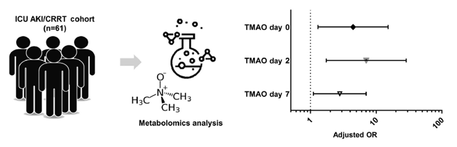 중환자실에 입원하여 중증의 급성신손상으로 지속성 신대체요법 치료를 시행 받은 152명의 환자를 대상으로 혈장 내 59개 대사체의 농도를 분석하였다. 3개월째까지 생존하여 콩팥 기능을 확인할 수 있었던 61명 환자의 신장 기능 예후와 대사체 간의 분석을 통해 TMAO의 농도 증가가 3개월째 신장 기능 예후의 악화와 유의하게 관련됨을 확인하였다(그림1).