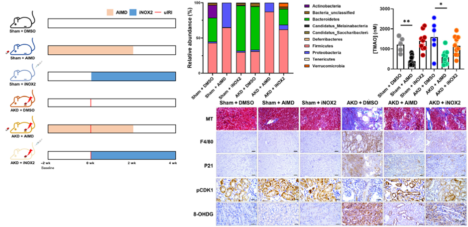 일측 신장동맥결찰을 통한 마우스 급성신손상-만성콩팥병 이행 모델을 확립한 이후, TMAO의 생성의 증가와 함께 신장 조직의 손상, 산화성 손상, 조직 염증, 세포 사멸 등이 유의하게 증가함을 확인하였다. 4가지 광범위 항생제를 마우스에 투여하여 항생제를 통한 마우스의 장내 미생물 변화를 성공적으로 유도하였다. 이를 통해 TMAO 생성과 관련된 Desulfovibrio, Clostridium 등의 장내 미생물을 감소시켰으며 질환 모델에서 TMAO의 농도 상승을 억제할 수 있음을 증명하였다.