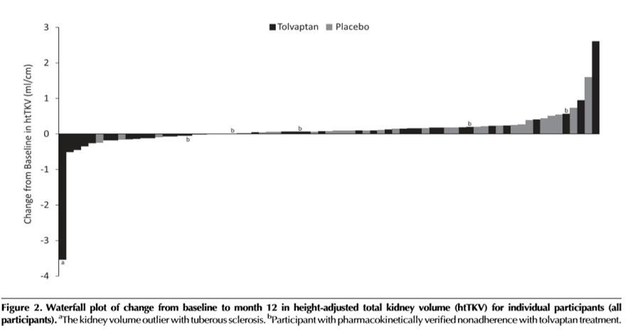 치료 순응도는 톨밥탄군 참가자 48명 중 46명(96%), 위약군 참가자 43명 중 40명(93%)에서 90% 이상이었다. 1차 평가로 spot urine 삼투압 및 비중의 기준선 대비 감소는 위약군보다 톨밥탄군에서 더 컸으며, 결과는 연령층 전반에 걸쳐 일관되었다(P <0.001). 2차 평가 기준인 기준선에서 12개월까지 htTKV의 백분율 변화는 12~17세 참가자가 위약(5.8%)보다 톨밥탄(2.6%)을 사용하여 더 낮은 신장 용적 증가율을 보였다.