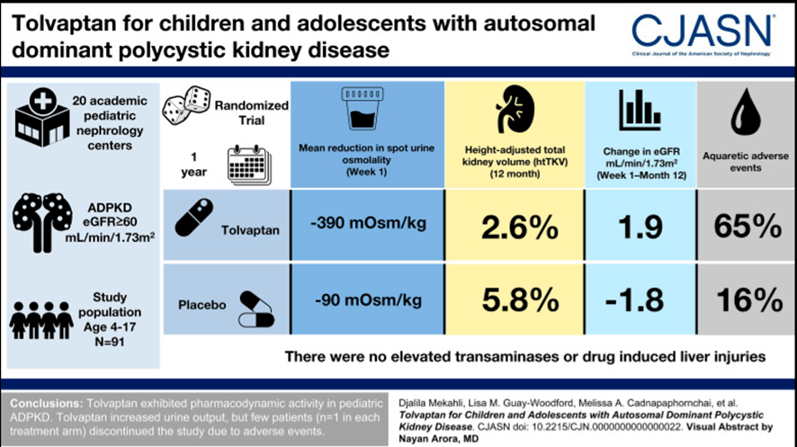 2023년 CJASN에 게재된 이 논문은 4~17세의 소아 ADPKD 환자를 대상으로 임상 3상, 무작위 이중 맹검 위약 대조, 다기관 시험을 시행하여 소아 및 청소년 ADPKD 환자의 톨밥탄의 약력학, 안전성 및 효능을 평가하였다. 2016년 9월부터 2018년 11월까지 20개 소아 신장 센터 4개국(벨기에, 독일, 이탈리아, 영국)에 등록된 환아로 Schwartz 공식에 의한 eGFR ≥60ml/min/1.73m2, 20kg 이상의 ADPKD 환아를 대상으로 12~17세 소아(Group 1)는 MRI 상 0.5cm 이상인 신장 낭종이 10개 이상, 4~11세 소아(Group 2)는 초음파 검사에서 1cm 이상인 신장 낭종이 4개 이상인 경우로 정의하였다.